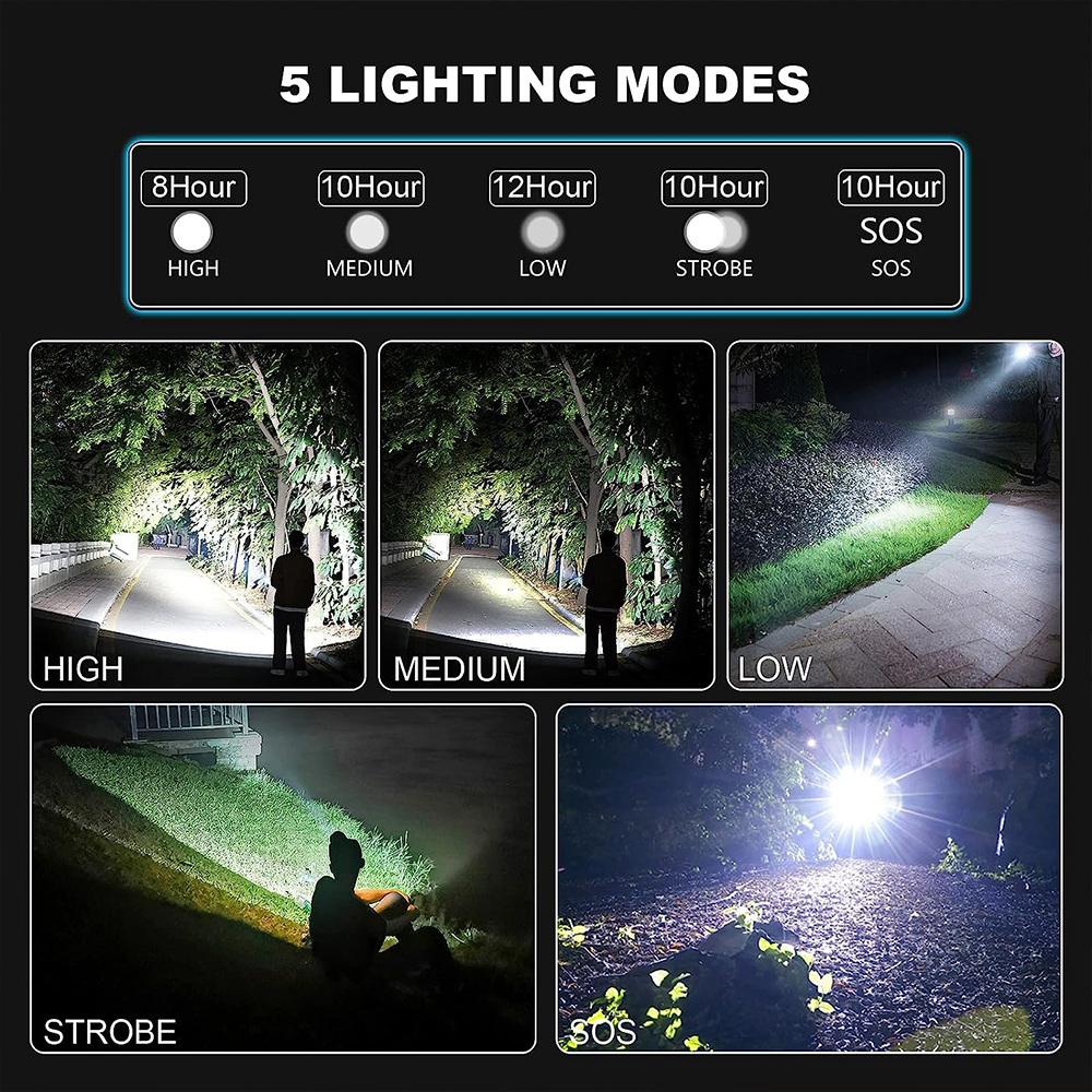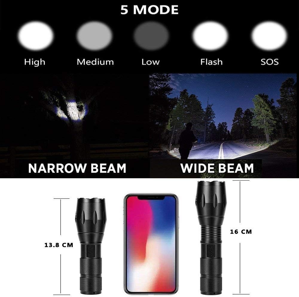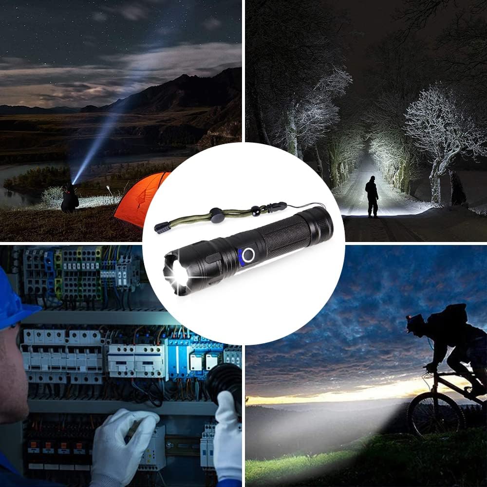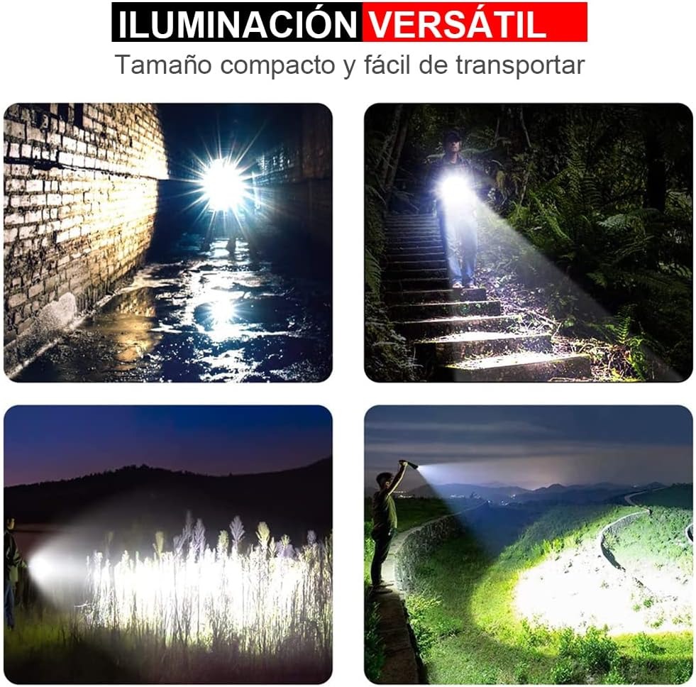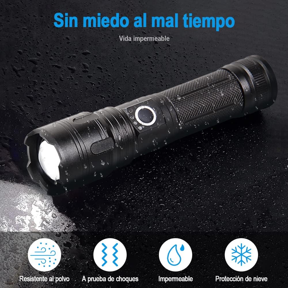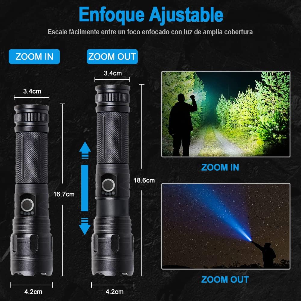 3000 Lúmenes Súper Brillante y Larga Duración:Linternas led alta potencia de 3000 lúmenes extremadamente brillante que produce un haz intenso de luz brillante hasta 1000 pies. Ilumina fácilmente una habitación de 200 metros cuadrados, muy adecuada para la pesca nocturna, pasear perros y emergencias domésticas. USB Recargable y Fácil de Transportar:La linterna LED se puede cargar directamente con nuestro cable USB, la entrada tipo c se puede conectar a computadoras portátiles, cargadores de automóviles y bancos de energía, etc. Hay 4 luces LED azules para informarle si la batería está cargada al 100/75/50/25%. Lo suficientemente pequeño como para guardarlo en su bolsillo, bolso, cajón o en el compartimiento del automóvil. Linterna de Enfoque Ajustable y 5 Modos:Zoom de haz ancho a estrecho y 5 configuraciones útiles (Alto / Medio / Bajo / Estroboscópico / SOS) hacen que las linterna led sean ideales para usar en la casa, pasear perros o acampar. La linterna camping genera un reflector brillante de área grande o un reflector perfectamente enfocado. Puede mantener pulsado durante 3 segundos en cualquier modo para cerrar el modelo actual. Duradero y Resistente al Agua IP67:La linterna es un cuerpo de aluminio de aviación duradero con un mango antideslizante y resistencia a los golpes que soporta un manejo brusco, puede soportar una caída de 3m. Una resistente cabeza de aleación de aluminio de cinco dientes brinda ayuda en situaciones de emergencia. Nuestra linternas led es resistente al agua y a los golpes IP67 para su uso bajo la lluvia, la nieve y otras situaciones de emergencia. Ampliamente Utilizado y Compre con Confianza:Esta linterna es utilizada por, bomberos, equipo de búsqueda y rescate, policías, etc. Perfecto para acampar, hacer senderismo, pescar, pasear perros, cortes de energía, emergencias o uso doméstico en general. Funciona con una batería recargable o 3 pilas AAA y puede funcionar de 4 a 8 horas. Incluye una bateria 26650 recargable de 2500 mAh.