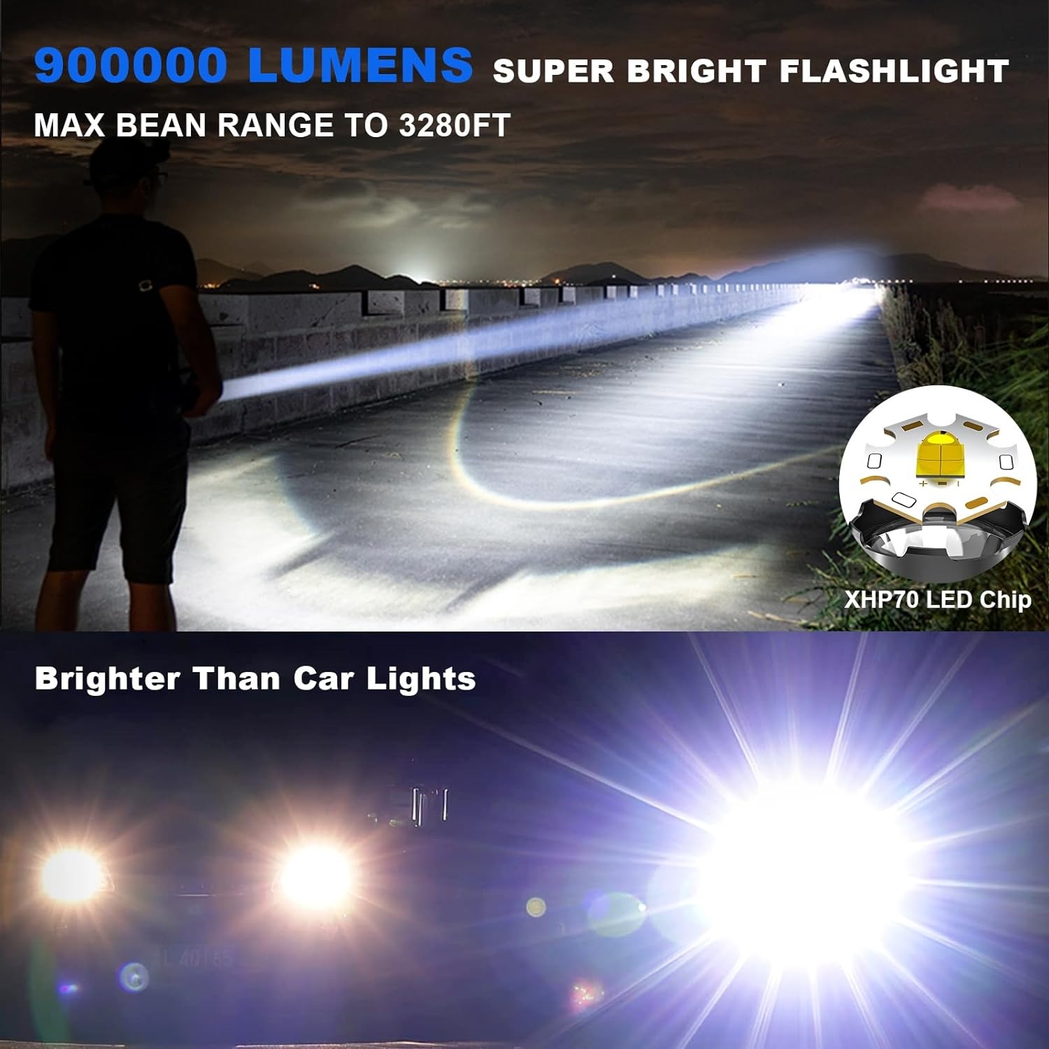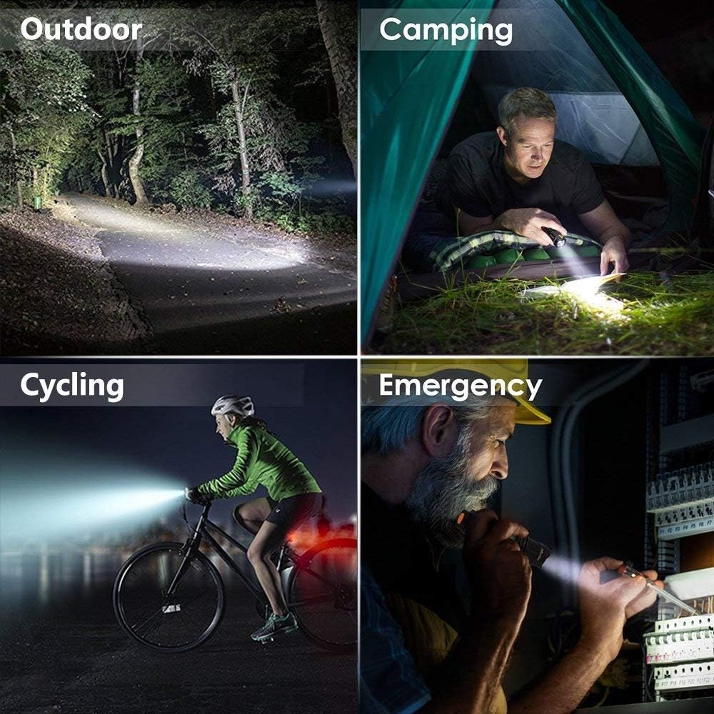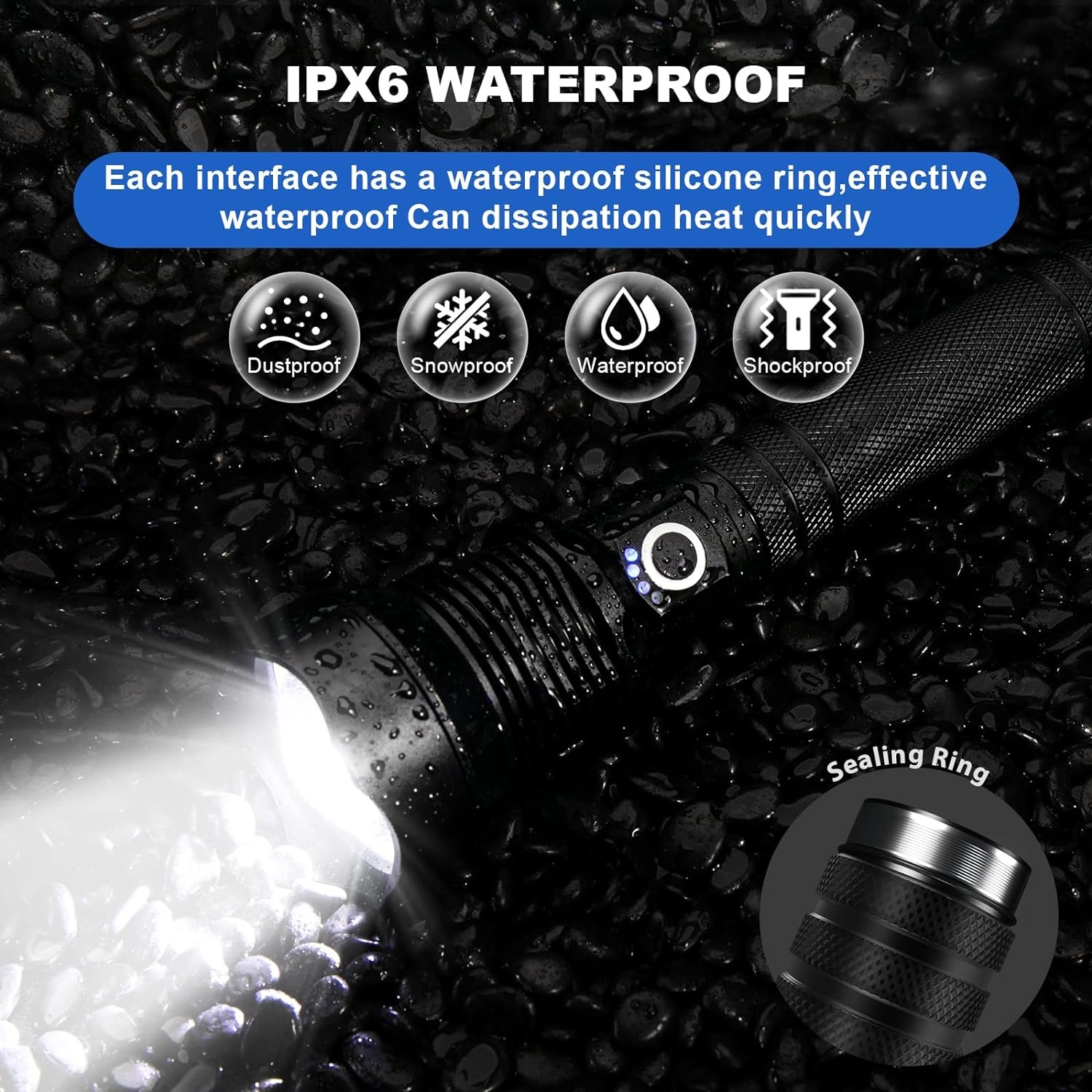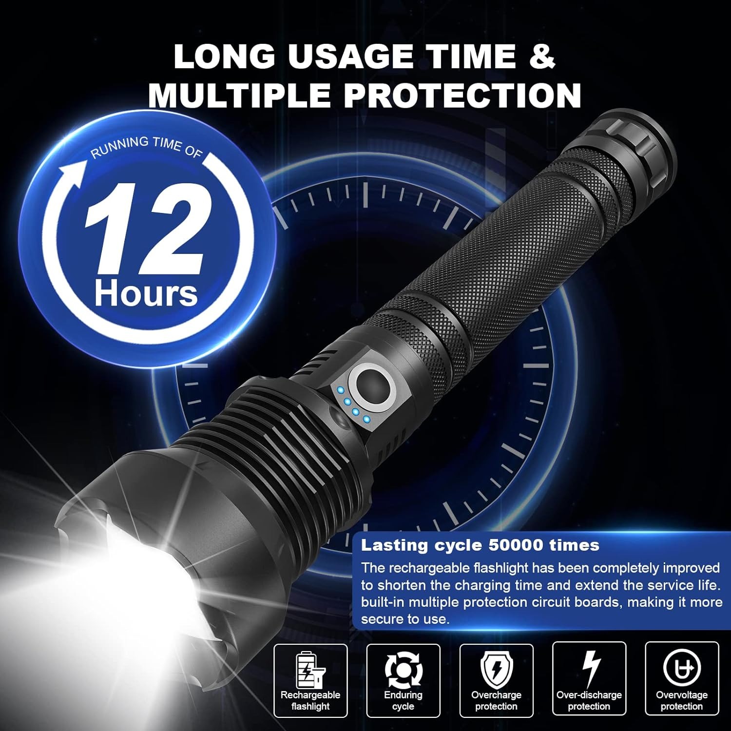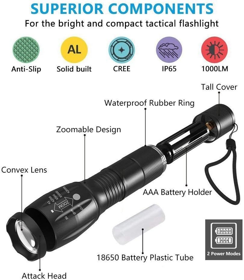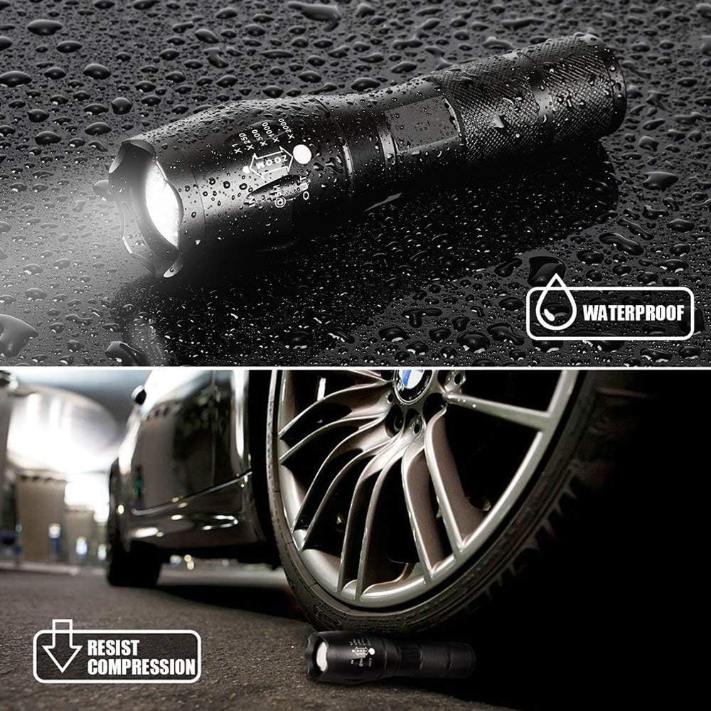 3000 Lúmenes Súper Brillante y Larga Duración:Linternas led alta potencia de 3000 lúmenes extremadamente brillante que produce un haz intenso de luz brillante hasta 1000 pies. Ilumina fácilmente una habitación de 200 metros cuadrados, muy adecuada para la pesca nocturna, pasear perros y emergencias domésticas. USB Recargable y Fácil de Transportar:La linterna LED se puede cargar directamente con nuestro cable USB, la entrada tipo c se puede conectar a computadoras portátiles, cargadores de automóviles y bancos de energía, etc. Hay 4 luces LED azules para informarle si la batería está cargada al 100/75/50/25%. Lo suficientemente pequeño como para guardarlo en su bolsillo, bolso, cajón o en el compartimiento del automóvil. Linterna de Enfoque Ajustable y 5 Modos:Zoom de haz ancho a estrecho y 5 configuraciones útiles (Alto / Medio / Bajo / Estroboscópico / SOS) hacen que las linterna led sean ideales para usar en la casa, pasear perros o acampar. La linterna camping genera un reflector brillante de área grande o un reflector perfectamente enfocado. Puede mantener pulsado durante 3 segundos en cualquier modo para cerrar el modelo actual. Duradero y Resistente al Agua IP67:La linterna es un cuerpo de aluminio de aviación duradero con un mango antideslizante y resistencia a los golpes que soporta un manejo brusco, puede soportar una caída de 3m. Una resistente cabeza de aleación de aluminio de cinco dientes brinda ayuda en situaciones de emergencia. Nuestra linternas led es resistente al agua y a los golpes IP67 para su uso bajo la lluvia, la nieve y otras situaciones de emergencia. Ampliamente Utilizado y Compre con Confianza:Esta linterna es utilizada por, bomberos, equipo de búsqueda y rescate, policías, etc. Perfecto para acampar, hacer senderismo, pescar, pasear perros, cortes de energía, emergencias o uso doméstico en general. Funciona con una batería recargable o 3 pilas AAA y puede funcionar de 4 a 8 horas. Incluye una bateria 26650 recargable de 2500 mAh.