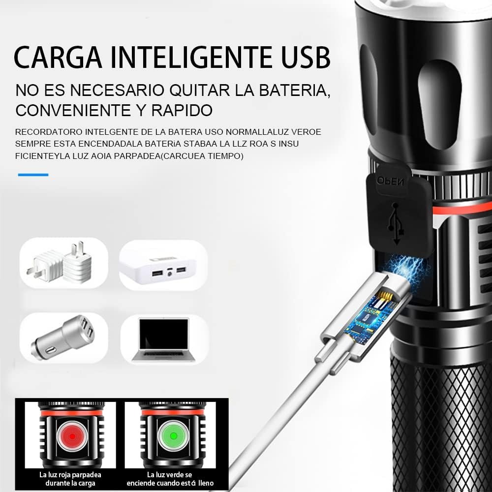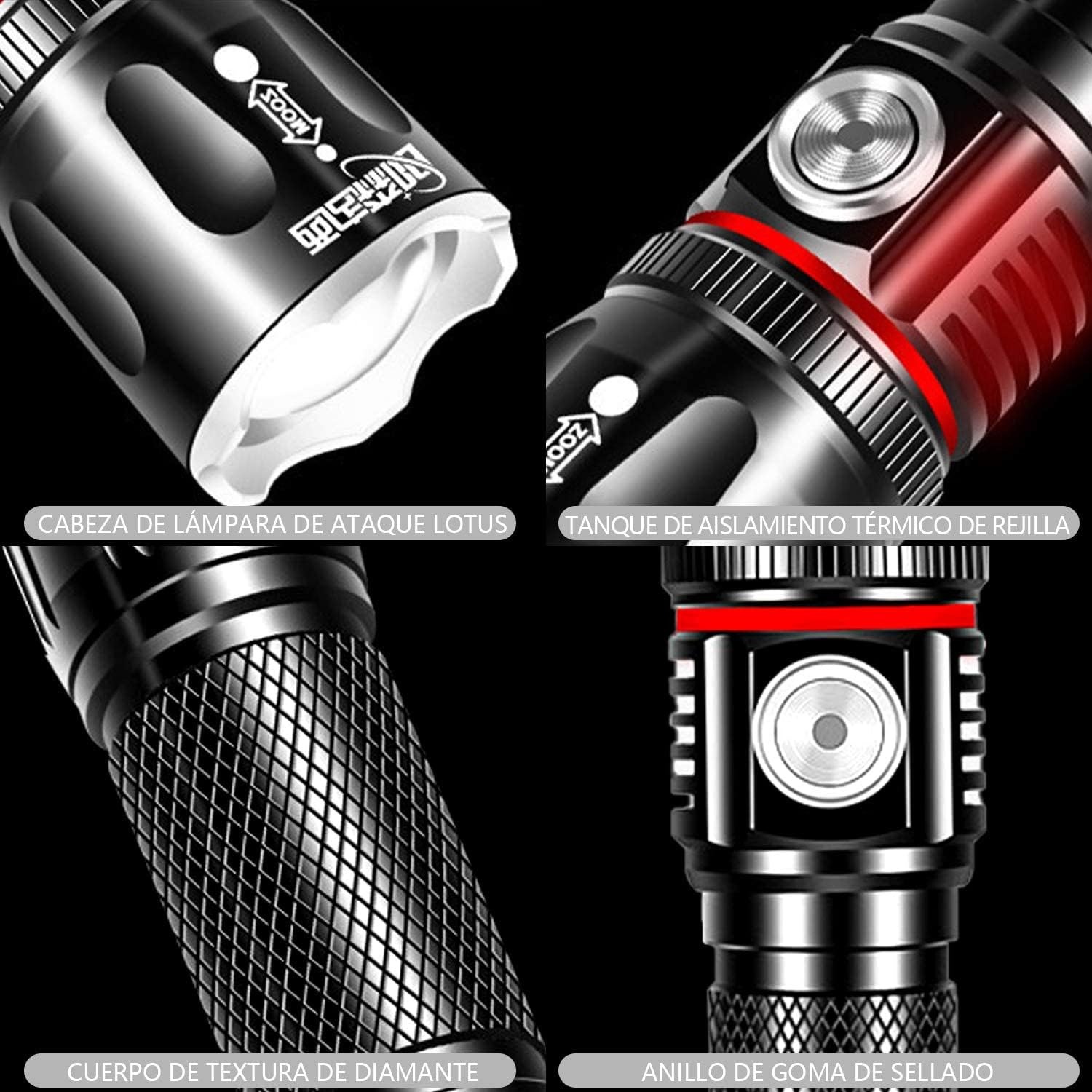 AMPLIO RAYO DE LUZ SUPER BRILLANTE:Esta linterna más luminosa del mercado. Su rayo de luz ultra amplio es capaz de iluminar sin esfuerzo alguno una habitación entera o un patio. Es unas 20 veces más brillante que las antiguas bombillas incandescentes y presenta un diseño solido y una luminosidad deslumbrante. Esta linterna LED presenta 4 modos (Alto / Bajo / Estroboscópico / Modos de luz lateral COB) Perfecto para sacar a pasear al perro, pescar o inspecciones mecánicas. DURADERO Y ESTABLE: Las LED tienen una vida media de 50000 horas, hasta 24 horas (modo ultra bajo) de luminosidad constante gracias a la batería recargable incluida, y La luz lateral tiene luz ultravioleta. La linterna es perfecta para usarla a diario y para las tareas más exigentes. DISEÑO MULTIFUNCIONAL AVANZADO: Esta linterna USB presenta tres características especiales, un potente imán, luz COB y en cualquiera de los modos, pulsa y mantén en dicha posición el botón durante 1 segundo para apagarla. Se pueden usar sin manos, poniéndolas en el capó, en varillas de hierro y acero y permitiéndote, de esa forma, tener las manos libres. FOCO AJUSTABLE Y A PRUEBA DE AGUA:El aluminio del cuerpo de la linterna evita la lluvia y la nieve. Este producto ha sido diseñado para ser prácticamente indestructible y resistir una caída de 10 pies o sumergirse en agua durante un periodo de tiempo determinado. El cuerpo presenta una aleación de aluminio, un bajo peso y tamaño compacto.