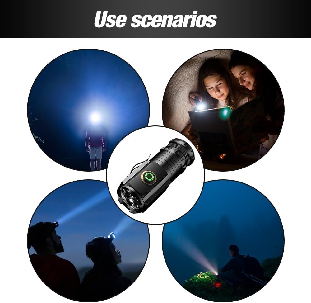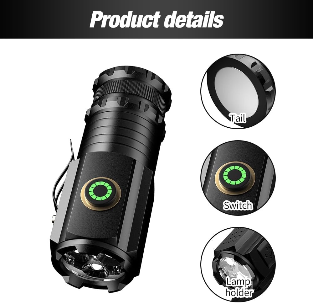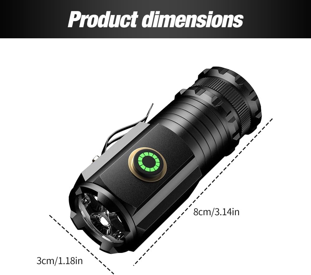 Mini Súper Potente Linterna Flash:Con cinco modos, incluyendo alta y media luminosidad, y una función de destello, esta linterna se adapta a cualquier situación. Ya sea que estés en aventuras al aire libre o realizando tareas cotidianas, esta linterna es una herramienta práctica y confiable que todos pueden apreciar. Iluminación de Alta Calidad:A pesar de su tamaño compacto, esta linterna resistente al agua cuenta con una mecha de alta calidad que emite un haz enfocado y ultra brillante, alcanzando distancias impresionantes. Puedes confiar en ella para iluminar incluso los lugares más oscuros. Construida para Durar:Elaborada con una resistente aleación de aluminio, esta linterna de bolsillo puede resistir caídas, un manejo brusco y la exposición a los elementos. Es un compañero duradero que puede enfrentar cualquier desafío que se presente. Además, su diseño ligero y el clip para bolígrafo facilitan su transporte en el bolsillo o su sujeción al cinturón. Carga USB Conveniente:Dile adiós a los frecuentes cambios de batería. Esta potente linterna ofrece una cómoda carga rápida a través de USB, asegurando que siempre tengas una fuente confiable de luz. Su clasificación resistente al agua garantiza durabilidad incluso en lluvias ligeras o salpicaduras.