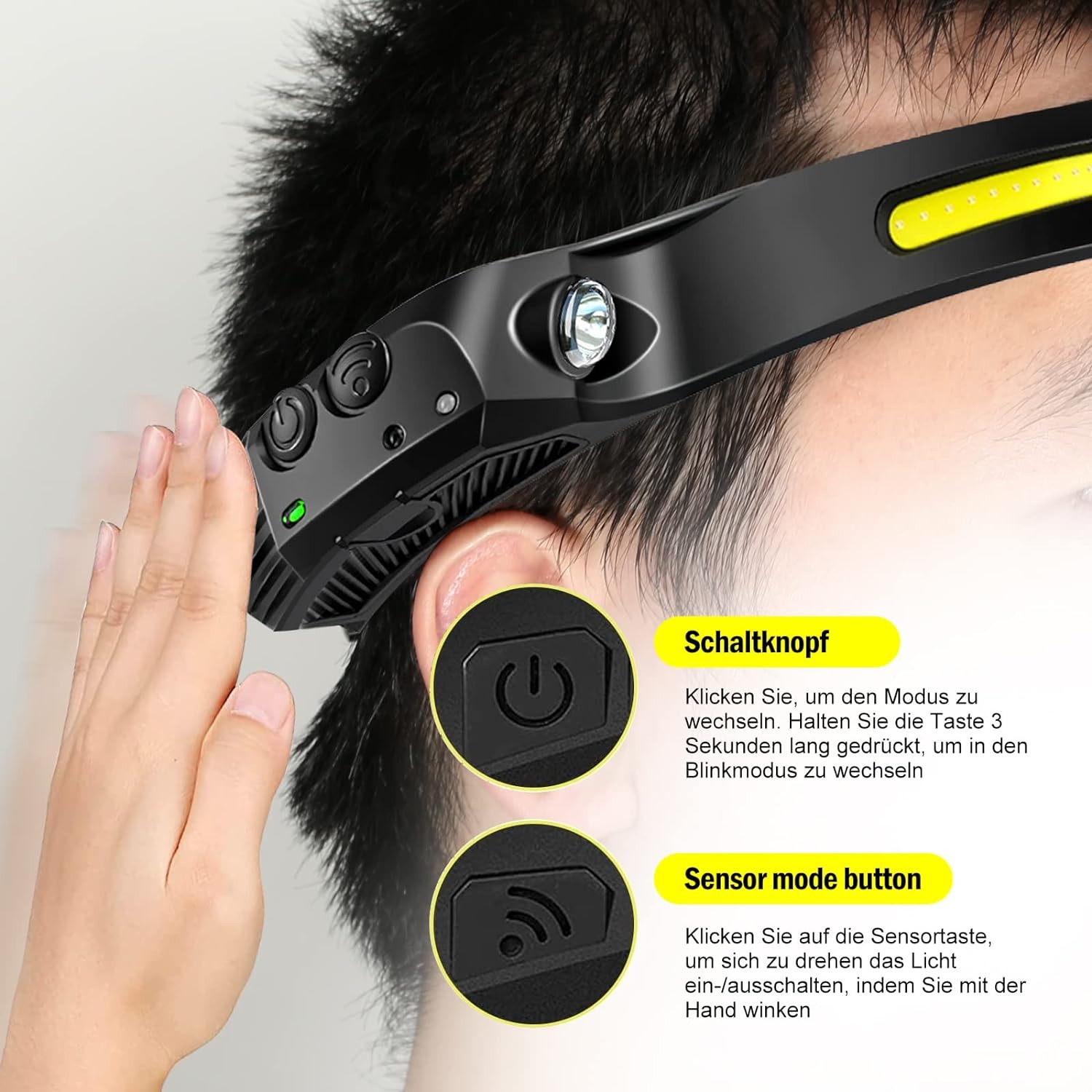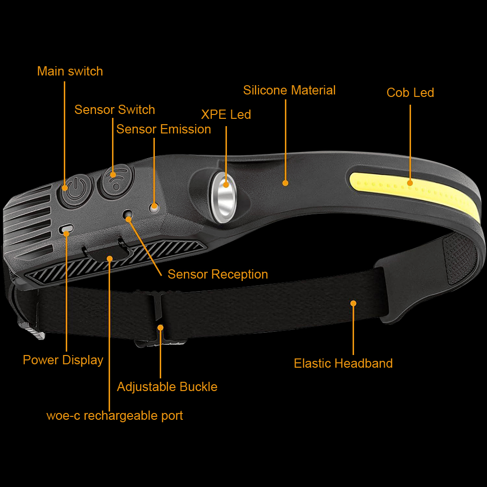 Sensor de Movimiento: Cuando el interruptor de función del sensor está encendido, lampara de cabeza funciona con el modo de inducción, encenderla y apagarla agitando la mano. Podrá liberar sus manos y evitar que la mano ensucie la luz. Ultraligero y Más Cómodo: Solo pesa 70g, la cabeza no tiene peso, muy cómodo con la diadema retráctil y altamente elástico, se puede adaptar a personas con varios tamaños de cabeza. Amplia gama de iluminación: Que pueden lograr una iluminación de amplio rango de 230 ° en el modo de iluminación de mazorca, El brillo ultraalto se puede adaptar a varios escenarios: carrera nocturna, ciclismo, camping, senderismo, mantenimiento, etc. 5 Modos de Iluminación: Modo COB alto, modo COB bajo, modo XBE alto, modo XBE bajo y modo estroboscópico. En cualquier otro modo, mantenga presionado el botón de encendido / apagado para cambiar el modo estroboscópico, y las luces XBE y COB parpadearán al mismo tiempo.