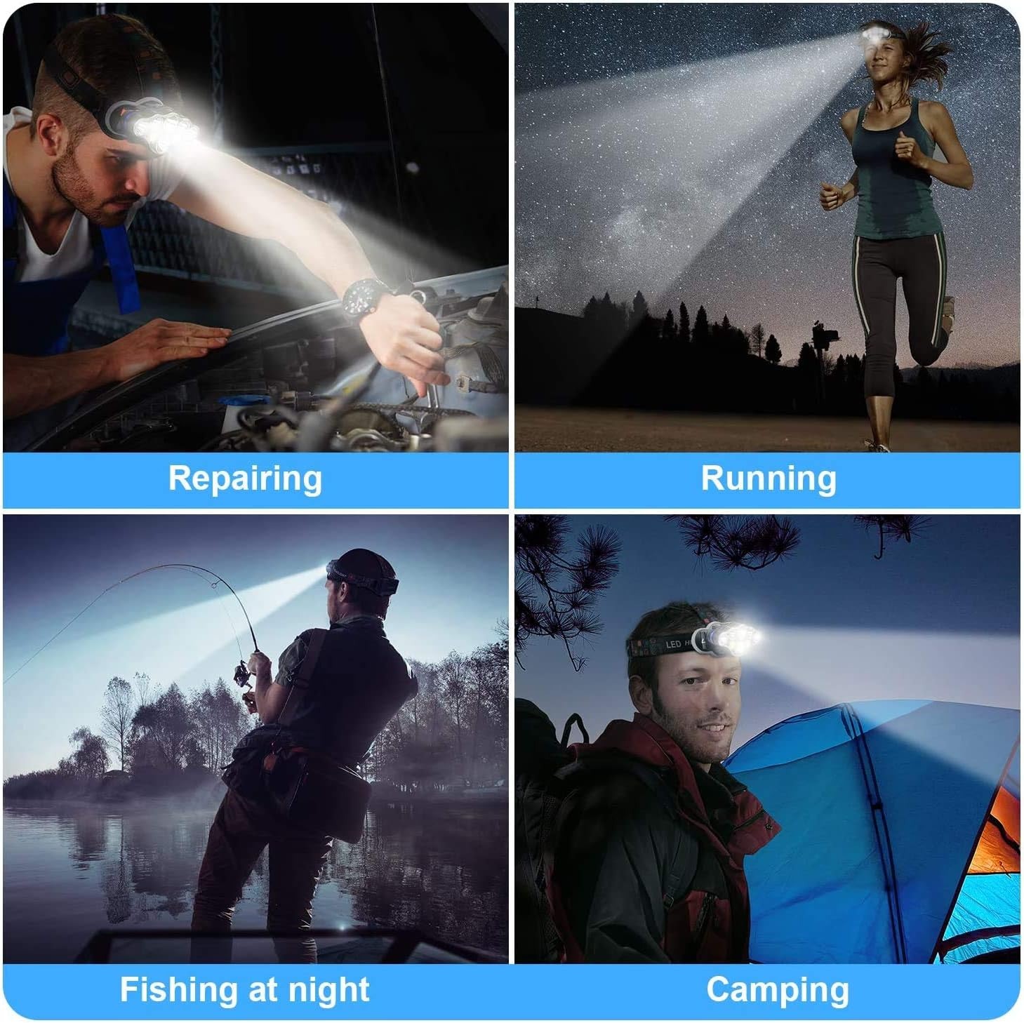 Lámpara Cabeza LED Linterna, 4 modos de luz ajustable, impermeable, para Camping, Pesca, Exterior, Reparación de Coche -2de paquete