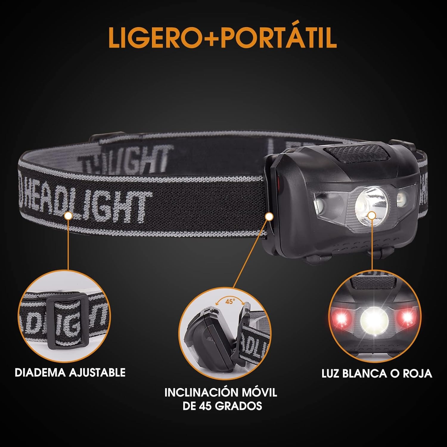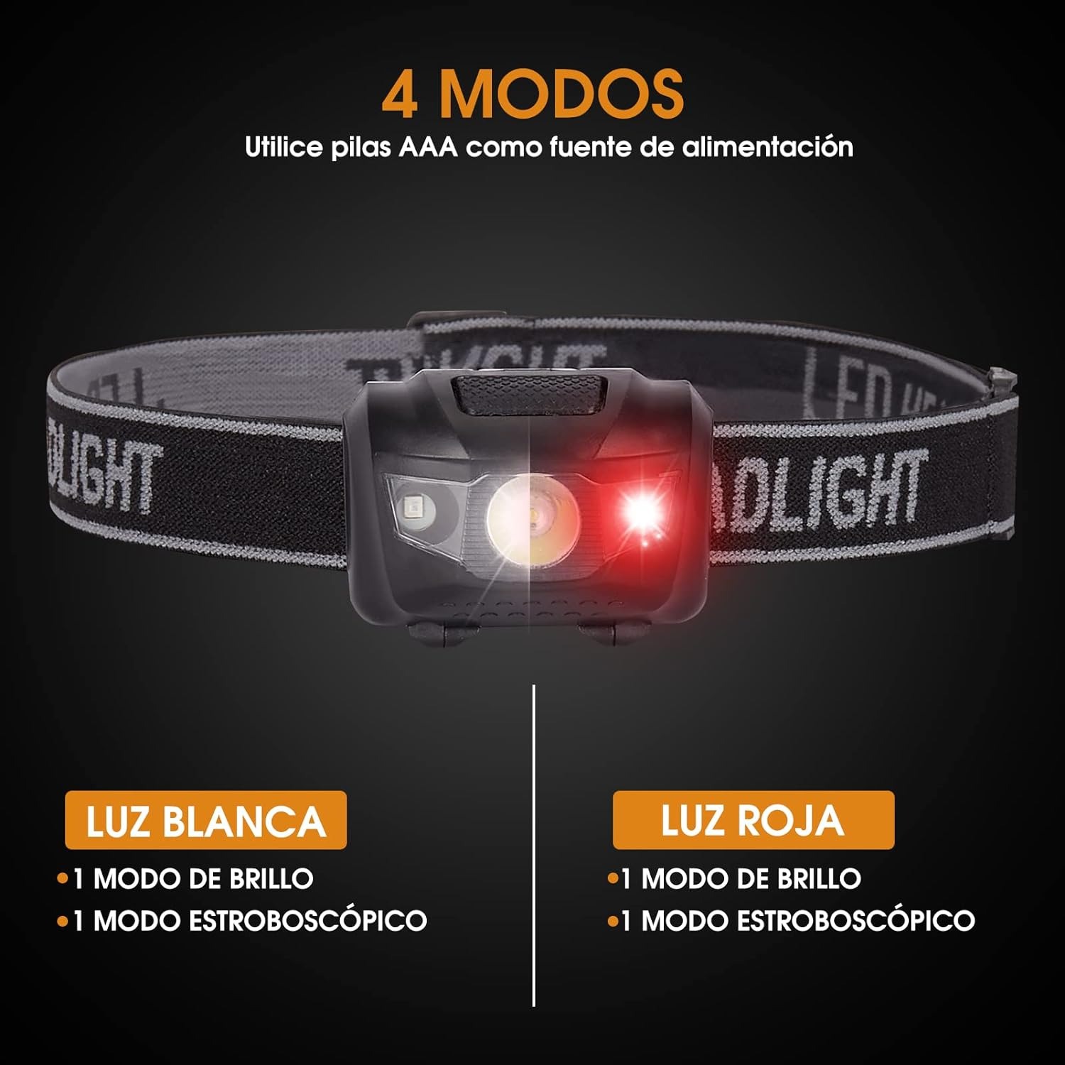 Bombilla LED de alto brillo,Este producto viene con 1 bombilla LED de 3 W y 2 bombillas LED rojas, el faro se puede girar 75°, lo que te permite ajustar mejor el modo adecuado y es más cómodo de usar. Batería AAA ,La principal fuente de alimentación de este faro son 3 baterías AAA, que pueden usarse durante mucho tiempo y respaldar actividades al aire libre a largo plazo. En comparación con el faro recargable USB, lo salva de la necesidad repentina de cargar cuando está afuera. PD: El producto no incluye pilas. La función del interruptor ,El interruptor en el lado izquierdo de la operación es 2 LED rojos encendidos - 2 LED rojos parpadeando - apagados. El interruptor de la derecha es LED CREE de 3 W de brillo total-LED CREE de 3 W de brillo medio-LED CREE de 3 W intermitente. Material livian :El material impermeable garantiza la protección contra salpicaduras o rocío de agua desde cualquier ángulo, solo 70 gramos de peso, correa elástica de poliéster ajustable, el peso liviano reduce la presión sobre la cabeza, lo que le permite transportarlo fácilmente para un trabajo conveniente.PD: Se puede remojar en agua durante no más de media hora por un corto tiempo.