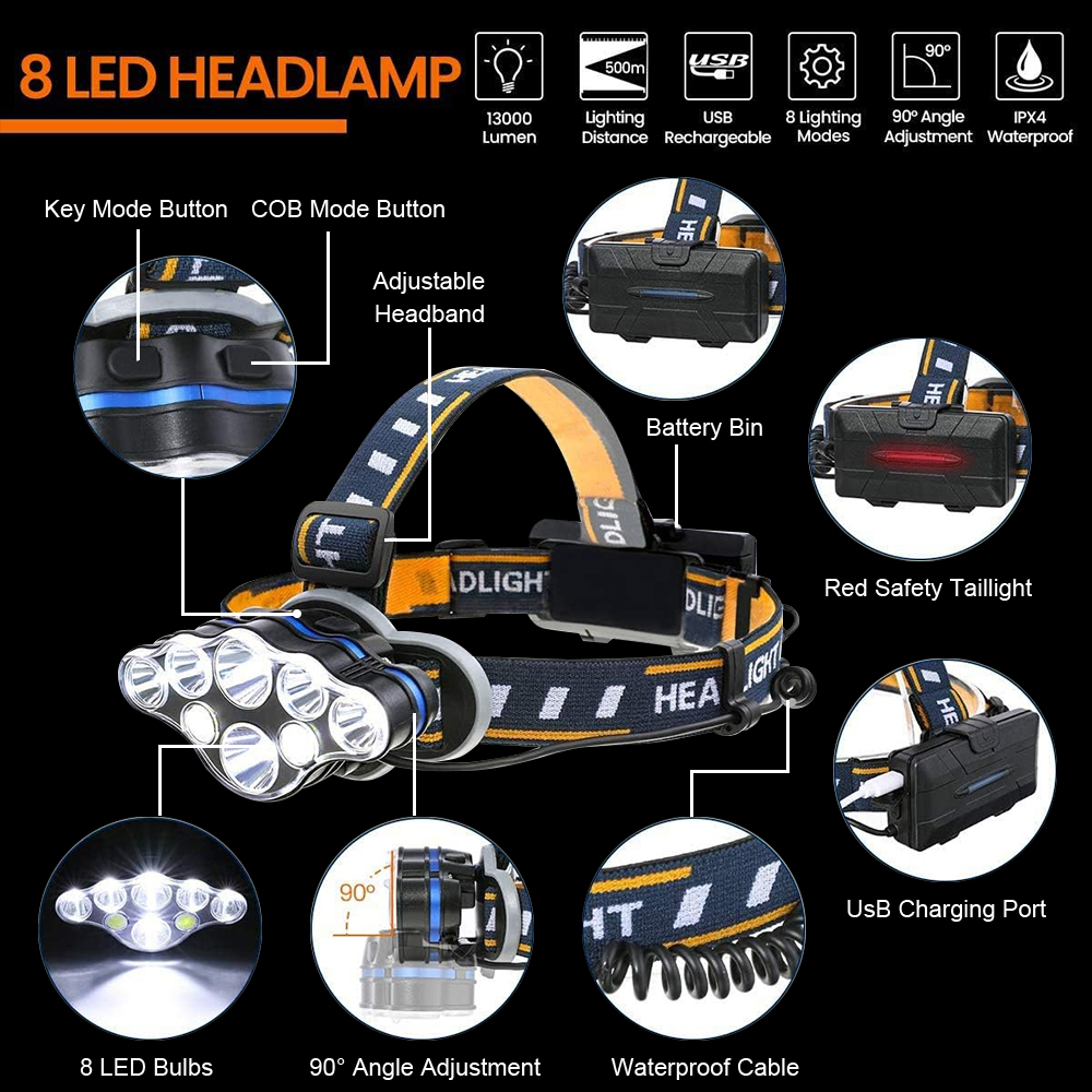 Súper brillante y duradero: el faro brillante está compuesto por 8 bombillas LED, que pueden proporcionar un brillo excelente, y el rango de iluminación máximo es de hasta 600 metros, por lo que puede ver claramente el entorno circundante en la oscuridad. El faro recargable tiene una larga vida útil y puede funcionar durante 7-9 horas después de estar completamente cargado. Carga USB y 8 modos de iluminación: el faro LED está equipado con dos baterías extraíbles, que se pueden cargar con el cable USB incluido y se pueden utilizar durante mucho tiempo. El faro LED tiene 8 modos de iluminación, y el cabezal de la lámpara se puede girar 90 ° hacia abajo. Puede ajustar el modo de iluminación y la dirección según sea necesario presionando dos botones, lo cual es muy fácil de usar. Luces traseras de seguridad y comodidad ajustables: este faro LED es liviano y está equipado con una diadema elástica de diseño ergonómico y un cojín de espuma para la cabeza, que se puede ajustar fácilmente para adaptarse a la mayoría de las circunferencias de la cabeza y es cómodo de llevar. Hay una luz trasera de seguridad roja en la parte posterior de la caja de la batería, que puede recordarle que debe correr durante el viaje o por la noche para brindar un entorno más seguro.
