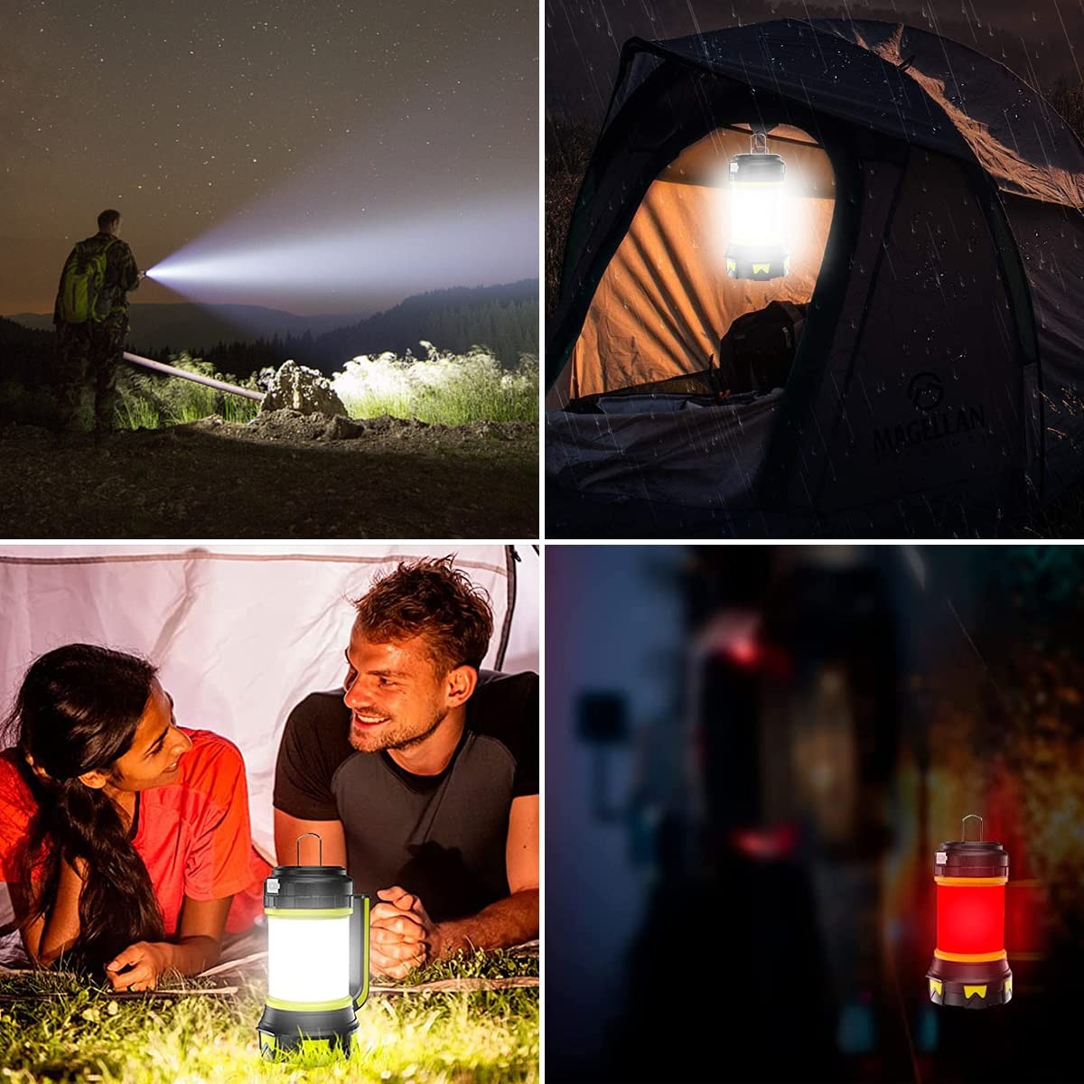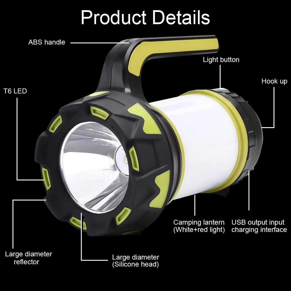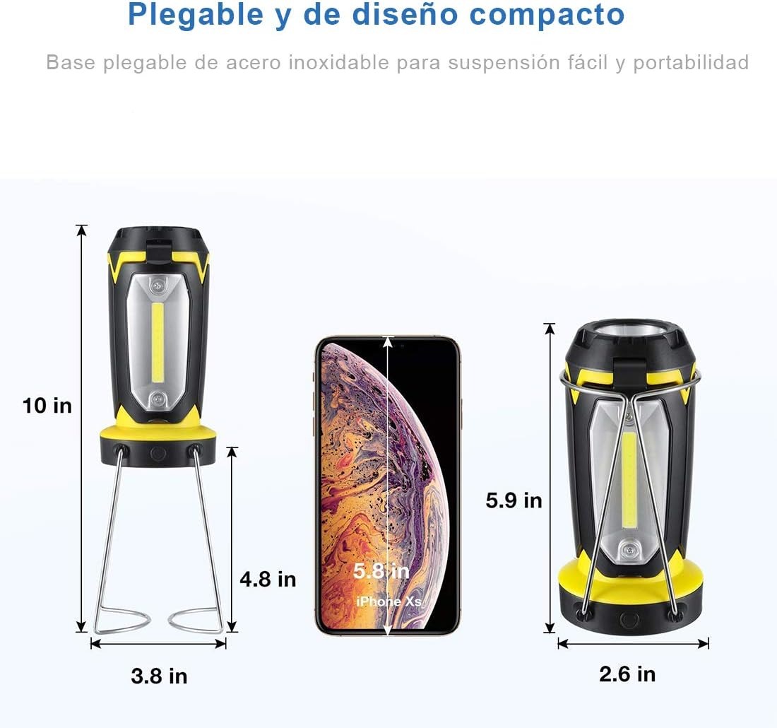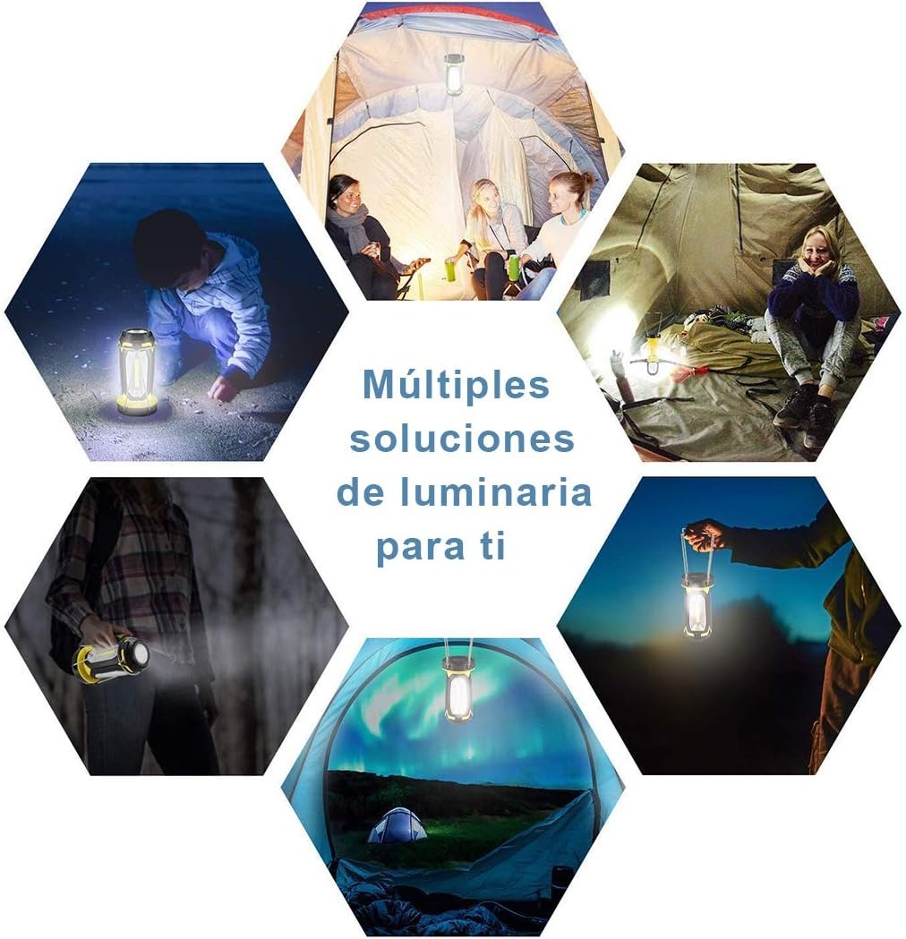 La batería de litio recargable de gran capacidad 18650 incorporada, recargable, se puede utilizar como linterna de emergencia o fuente de alimentación móvil. IPX6 a prueba de agua, la linterna está hecha de material ABS, que puede soportar salpicaduras de lluvia, perfecta para acampar, hacer caminatas, pescar, escalar montañas, andar en bicicleta, viajar, hacer picnics, huracanes, terremotos, cortes de energía, pasear perros, etc. 6 modos de iluminación, modo de luz alta/baja (linterna), modo de luz lateral alta/baja (luz de campamento), luz roja fija y luz estroboscópica (SOS), pueden prepararlo para la oscuridad, cortes de energía, huracanes y emergencias. La luz de la tienda también tiene un asa y un gancho bidireccional, que se puede sostener en la mano mientras se camina o colgar en ramas, techos de automóviles o tiendas de campaña para iluminar.