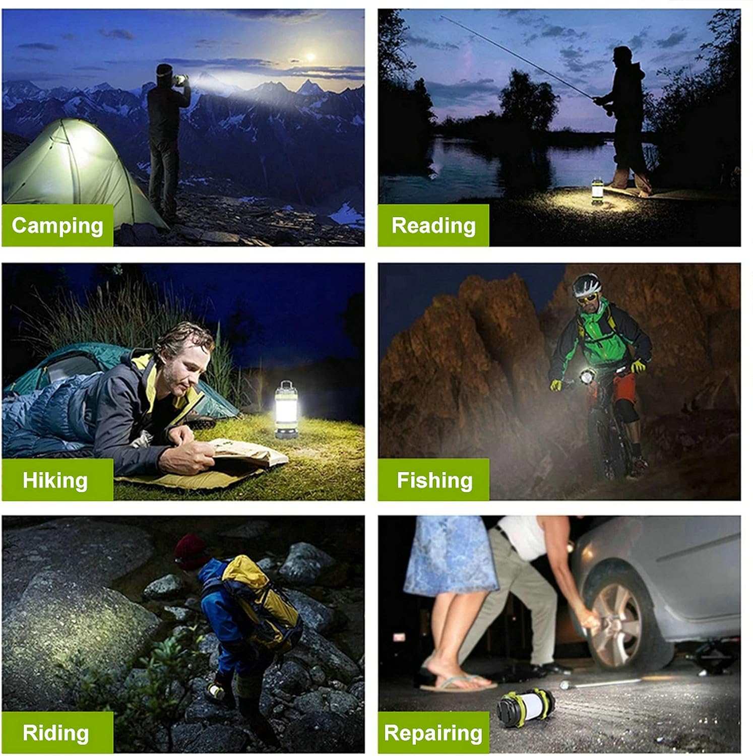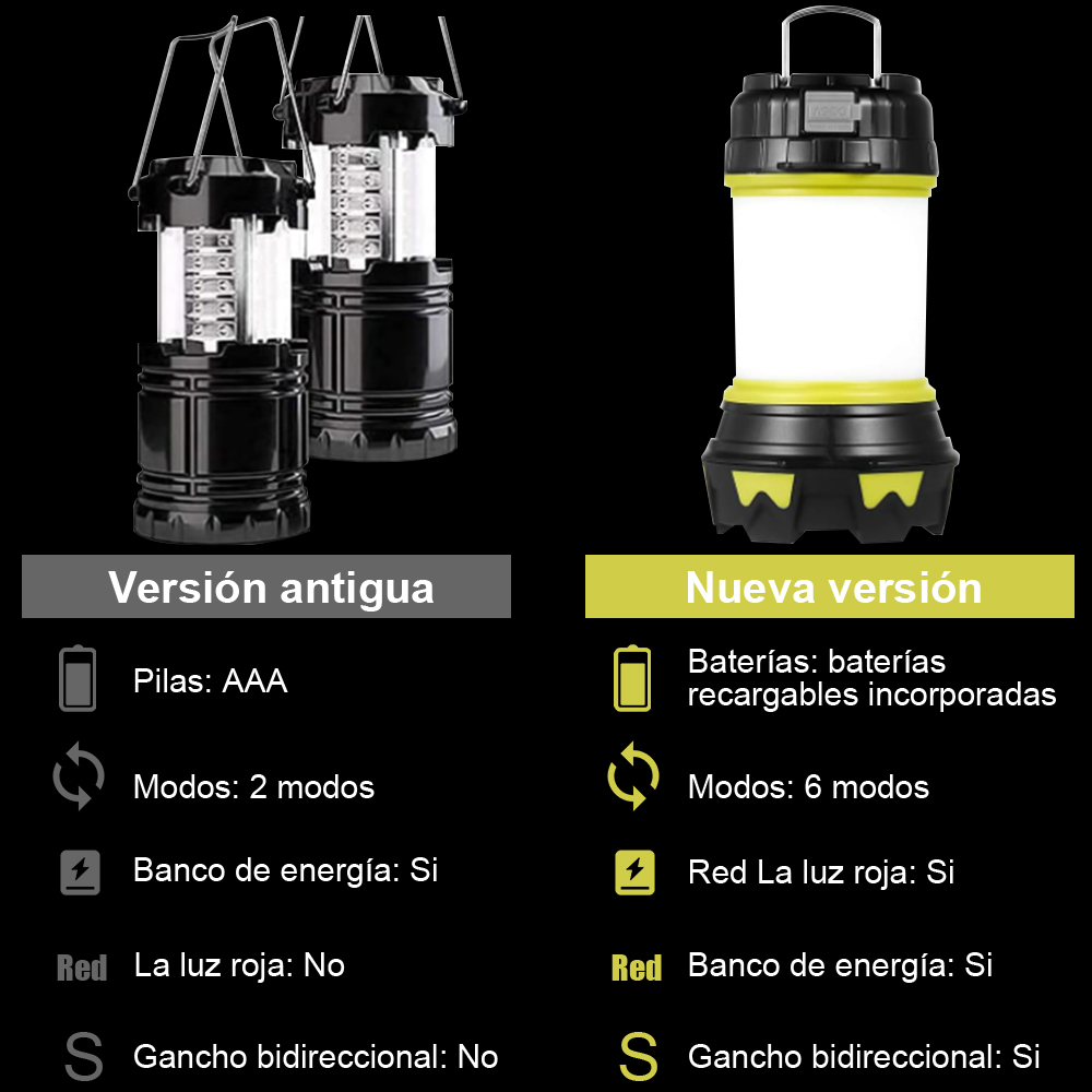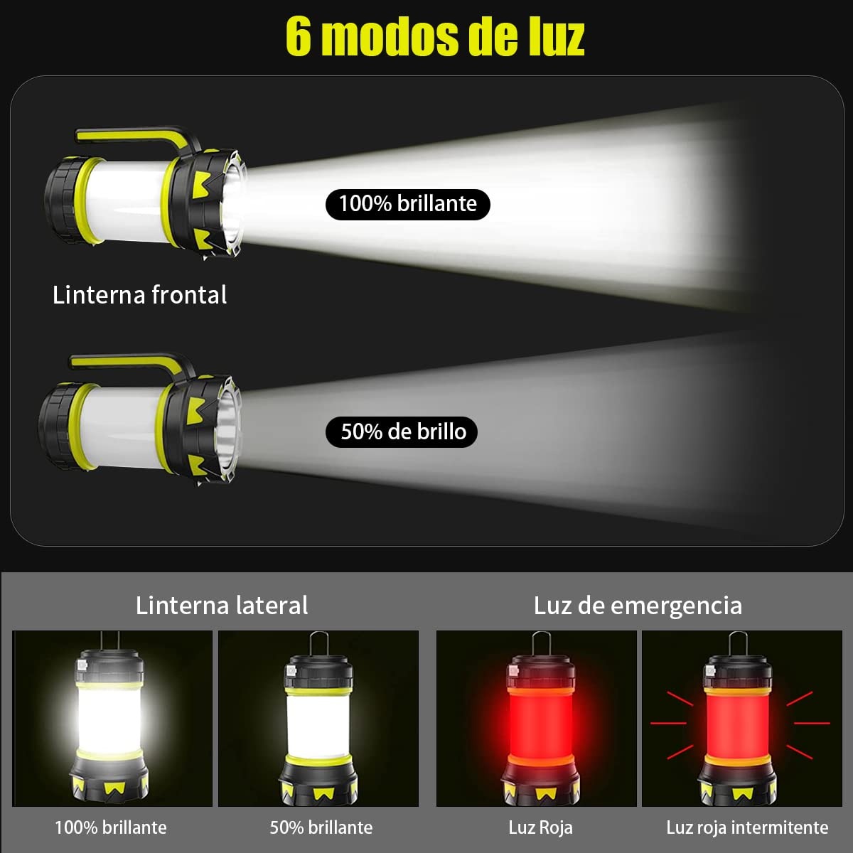 La batería de litio recargable de gran capacidad 18650 incorporada, recargable, se puede utilizar como linterna de emergencia o fuente de alimentación móvil. IPX6 a prueba de agua, la linterna está hecha de material ABS, que puede soportar salpicaduras de lluvia, perfecta para acampar, hacer caminatas, pescar, escalar montañas, andar en bicicleta, viajar, hacer picnics, huracanes, terremotos, cortes de energía, pasear perros, etc. 6 modos de iluminación, modo de luz alta/baja (linterna), modo de luz lateral alta/baja (luz de campamento), luz roja fija y luz estroboscópica (SOS), pueden prepararlo para la oscuridad, cortes de energía, huracanes y emergencias. La luz de la tienda también tiene un asa y un gancho bidireccional, que se puede sostener en la mano mientras se camina o colgar en ramas, techos de automóviles o tiendas de campaña para iluminar.