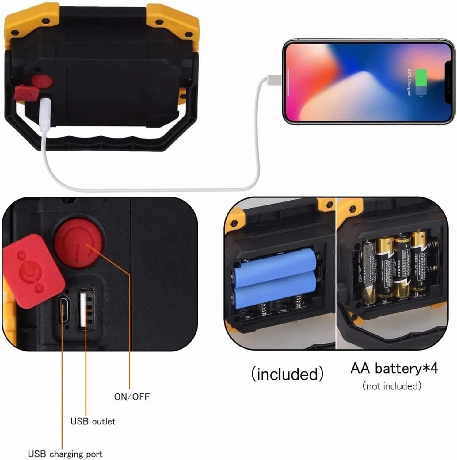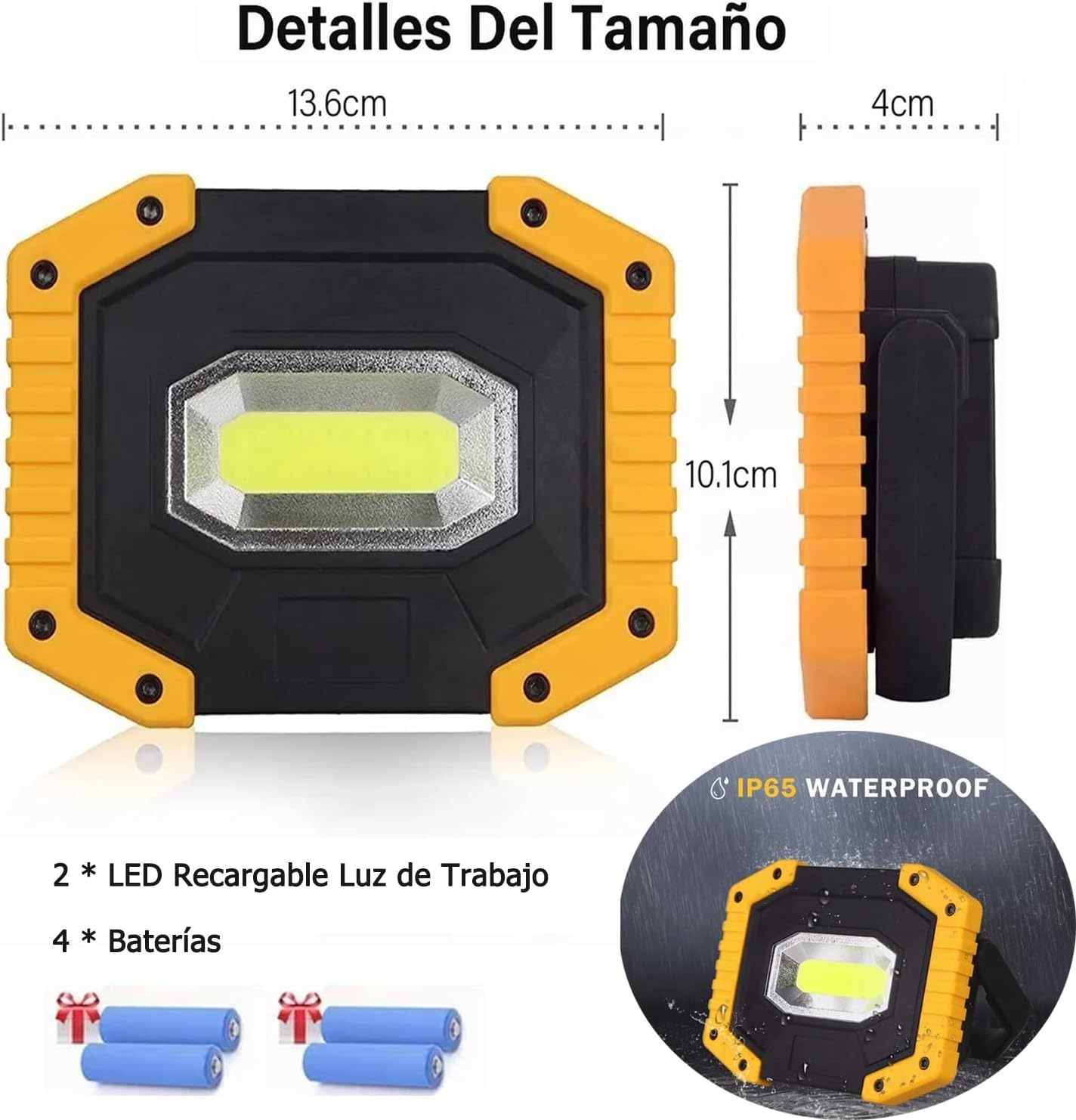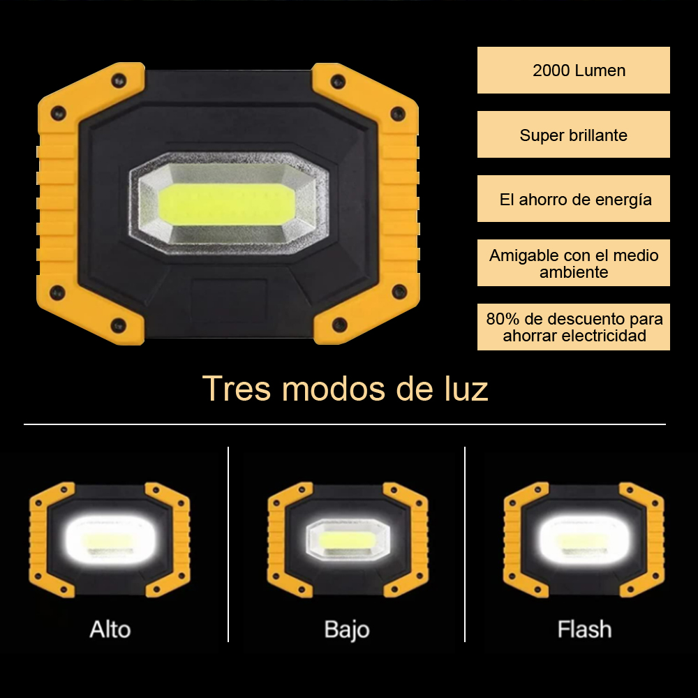 3 modos de iluminación: alto/bajo/estroboscópico, la luz de trabajo LED de 30 W proporciona hasta 2000 lúmenes. Paquete de 2 luces exteriores portátiles: el modo de poca luz ahorra energía, ideal para lectura u otras aplicaciones de iluminación de corta distancia. El modo estroboscópico se puede utilizar en emergencias. Resistente al agua y portátil: clasificación de impermeabilidad IP65, lo que significa que puede evitar salpicaduras de agua desde todos los ángulos. Diseño de mango plegable, equipado con portalámparas ajustable de 180 grados, muy cómodo de llevar. RECARGABLE: El kit de luz de trabajo contiene 2 baterías recargables y viene con un cable USB para una carga rápida y sencilla. Además, puede cargar su teléfono celular y otros dispositivos en caso de emergencia. USOS VERSÁTILES: Perfecto para acampar, hacer caminatas, pescar, asar, reparar automóviles o camiones, iluminar talleres, garajes, tiendas y jardines, explorar y más para trabajos en interiores o exteriores u otras actividades.