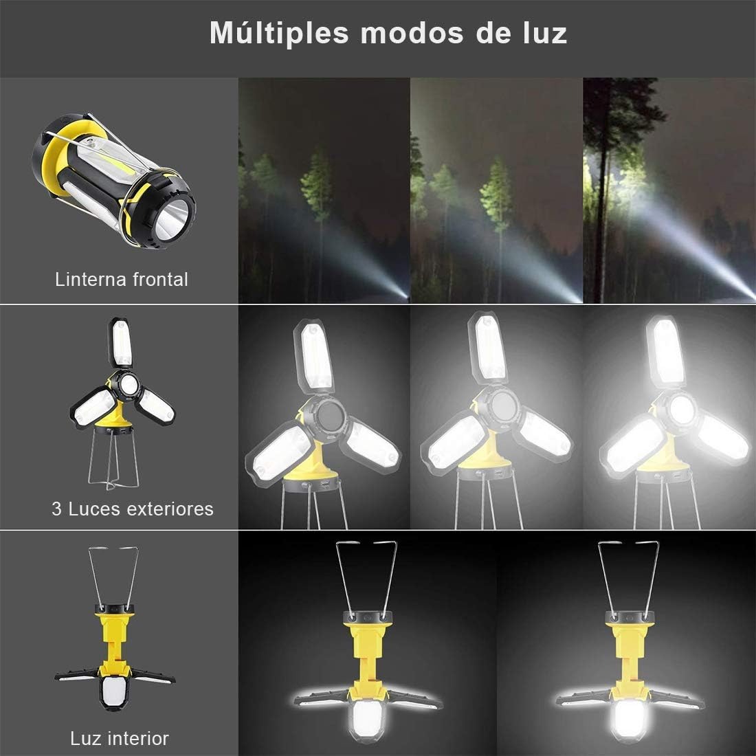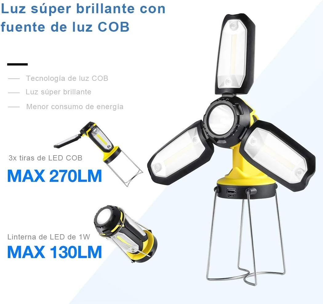 Camping Linterna LED Multifuncional, Lámpara de trabajo recargable 2200 mAh Banco de Potencia, Plegable, Súper Brillante, prop de Salvamento del Campamento.