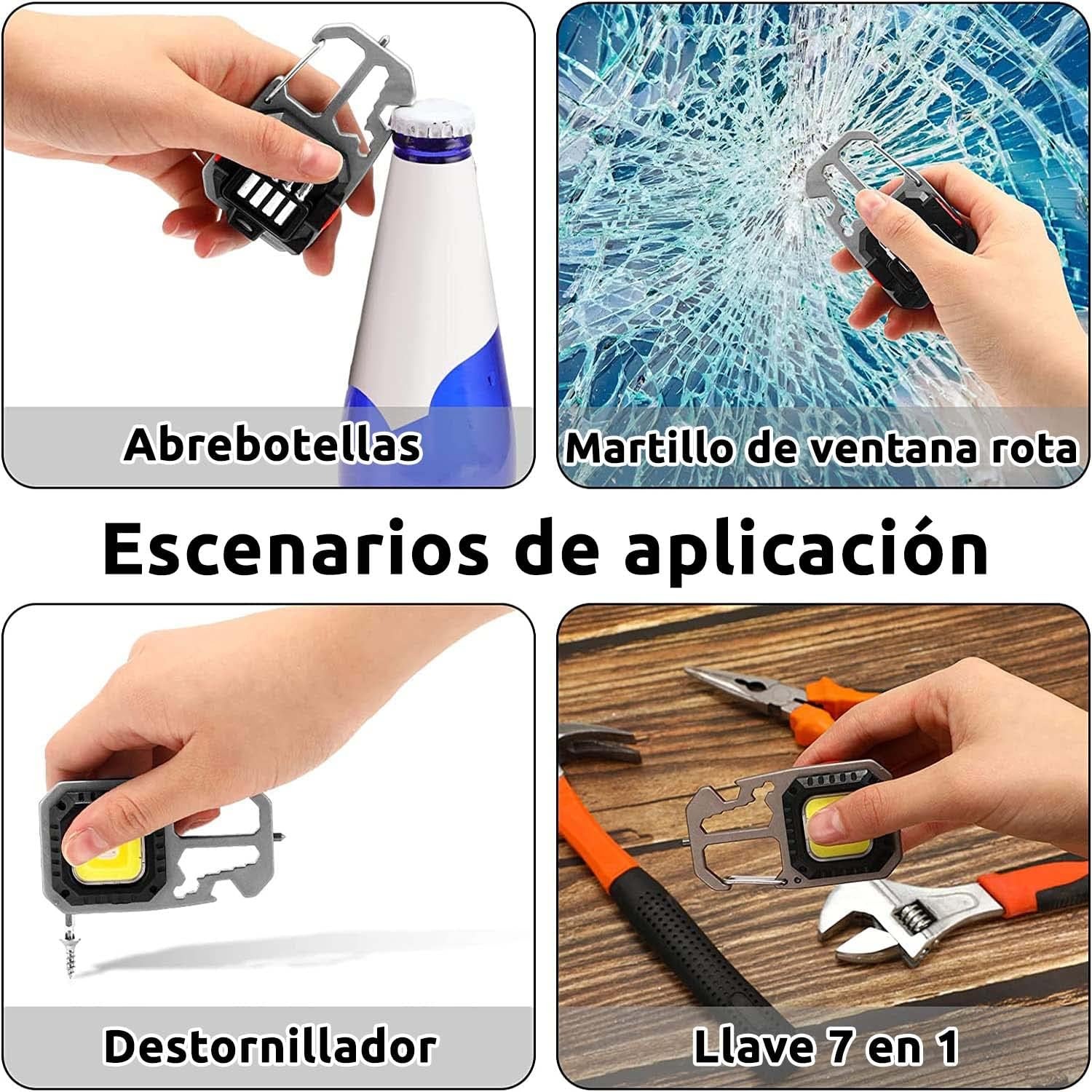 【Muy brillante】Brillo de hasta 800 lúmenes, batería de 500 mA y 24 cuentas LED internas, que proporcionan una luz brillante de gran angular. Iluminación continua de alto brillo durante 2-3 horas, iluminación continua de bajo brillo durante 4 horas. 【Impermeable y a prueba de caídas】Esta linterna de bolsillo está hecha de materiales ABS y aluminio de alta calidad, con 24 cuentas de lámpara concentradas en un área del tamaño del pulgar, impermeable y a prueba de caídas, y también viene con un 4 en 1. herramienta de tornillo. [Admite carga USB] Alimentado por una batería recargable de gran capacidad incorporada, simplemente conecte el cable de carga USB incluido a la mayoría de las fuentes de alimentación y habrá una luz indicadora de batería en la parte posterior. 【7 modos de iluminación】 Son luz blanca fuerte, luz blanca débil, luz amarilla fuerte, luz amarilla débil, luz roja y luz estroboscópica roja. Mantenga presionado el botón de encendido durante 2 segundos para aumentar el brillo. En el modo más brillante, la linterna Puede funcionar durante aproximadamente 2-3 horas. 【Amplia gama de usos】 Se puede usar como martillo de emergencia, abridor de botellas, destornillador, llave inglesa o luz de trabajo, y se puede usar en varios escenarios, como acampar al aire libre, pescar, hacer caminatas, escalar montañas, luces de emergencia para automóviles.